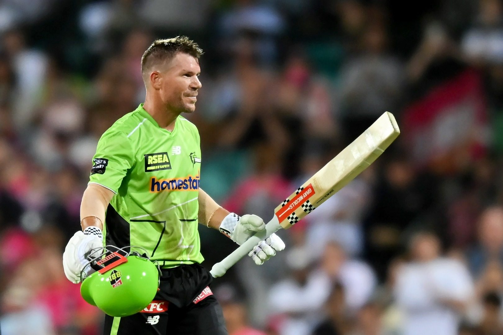 O jogador de estreia aposentado da Austrália marcou 110 pontos de invencibilidade para o Sydney Thunder no clássico local contra os Sixers, sua 10ª tonelada no críquete T20. Warner é o terceiro batedor a marcar 10 séculos T20; apenas Gayle (22) e Babar (11) marcaram mais no formato.